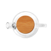 Чайник заварювальний виготовлений із високоякісного термостійкого боросилікатного скла, кришка виготовлена з бамбука, нержавіючої сталі та силікону,в горловині встановлена з'ємна спіраль, яка не дає виливатись в чашку заварку або фрукти. Об'єм 500 мл., запакований в картонну подарункову коробку та пупирчастий пакет для кращого зберігання при транспортуванні. Метод нанесення гравіювання на бамбукову кришку, деколь на скляну колбу