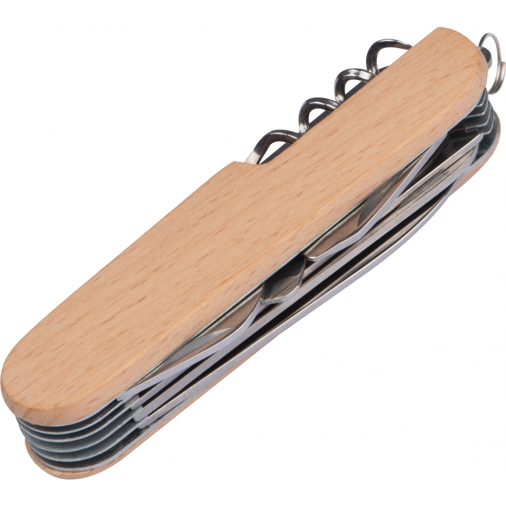 Кишеньковий ніж з нержавіючої сталі з 11 частинами, 2 пилками, ножицями, відкривалкою для пляшок та консервних банок, штопором, рашпілем, викруткою та ін. та дерев'яне покриття. Ваш логотип буде вигравіюваний на дерев'яному покритті.