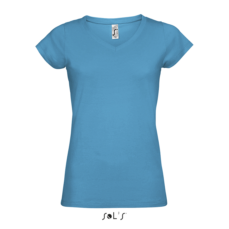 Жіноча футболка з V-подібним вирізом. Виріз оброблений рібом, зміцнююча тасьма по коміру. Виріб викроєн з трикотажного полотна. Приталена модель.