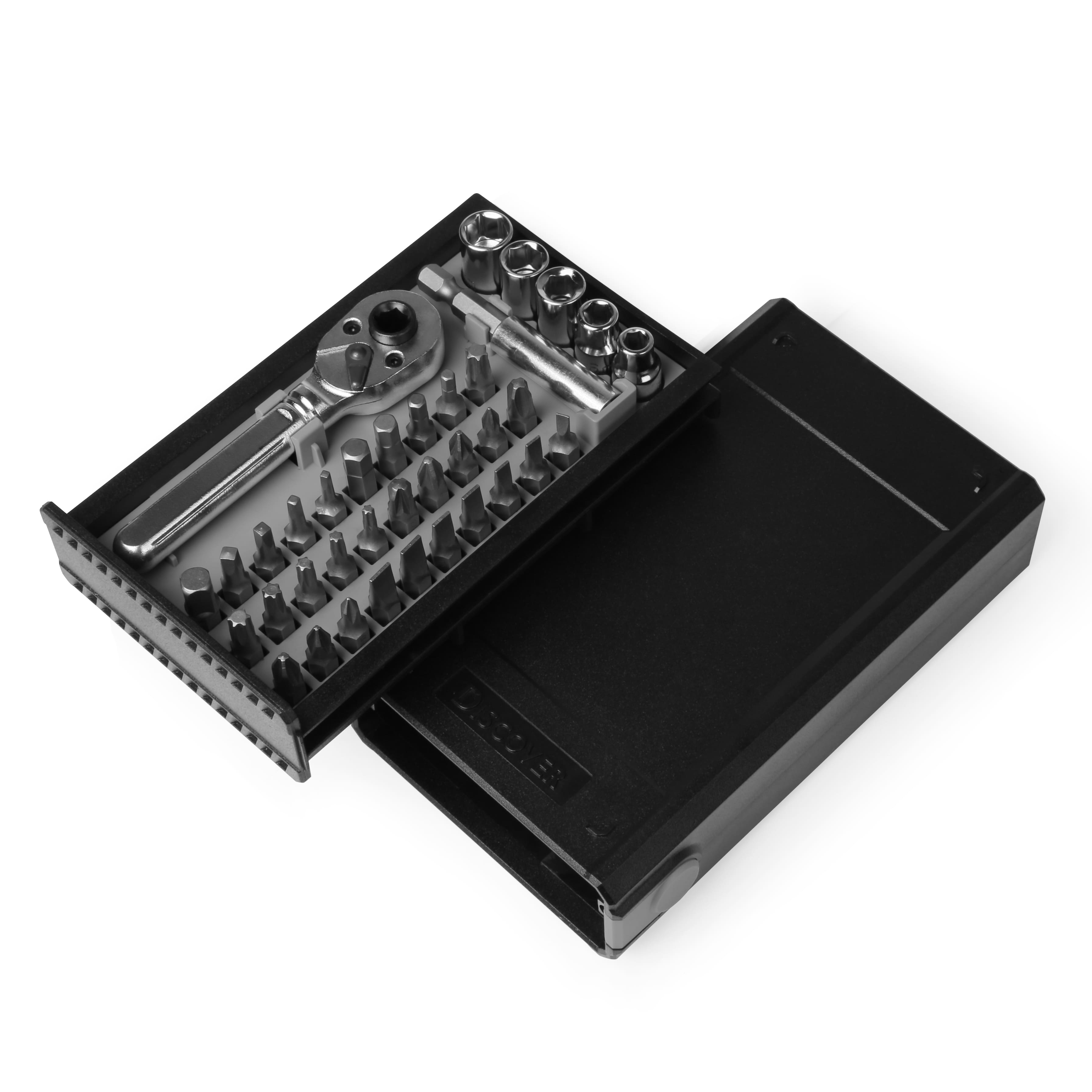 Набір з високоякісної сталі в компактній, пластиковій коробці, яка оригінально відкривається натиском на кнопку. В комплект входить 37 шт інструментів: